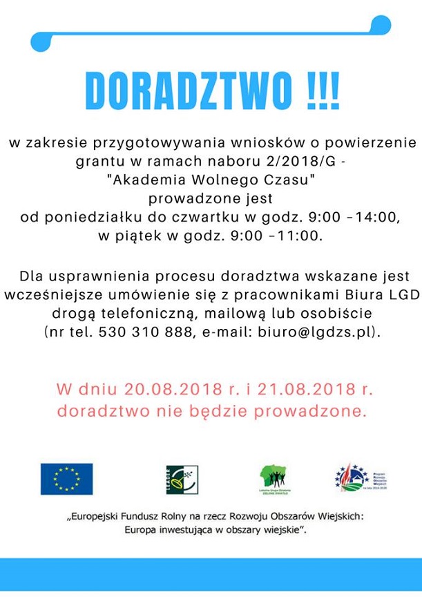 Przypominamy !!! W ramach naboru na granty 2/2018/G - Akademia Wolnego Czasu, można otrzymać 10 punktów za doradztwo.