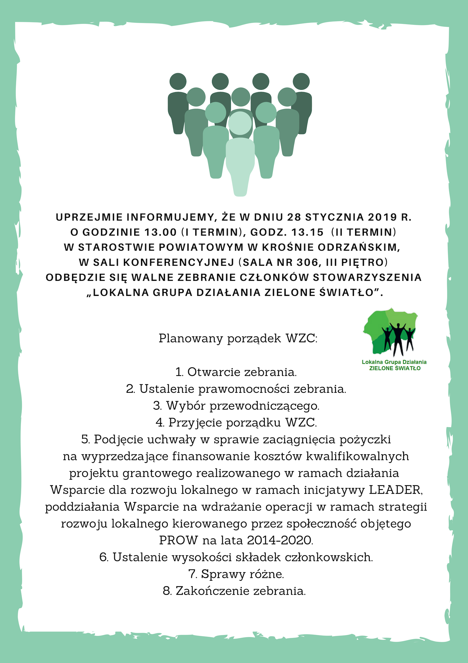 Uprzejmie informujemy, że w dniu 28 stycznia 2019r, w sali konferencyjnej odbędzie się walne zebranie członków stowarzyszenia "Lokalna Grupa Działania Zielone Światło".
