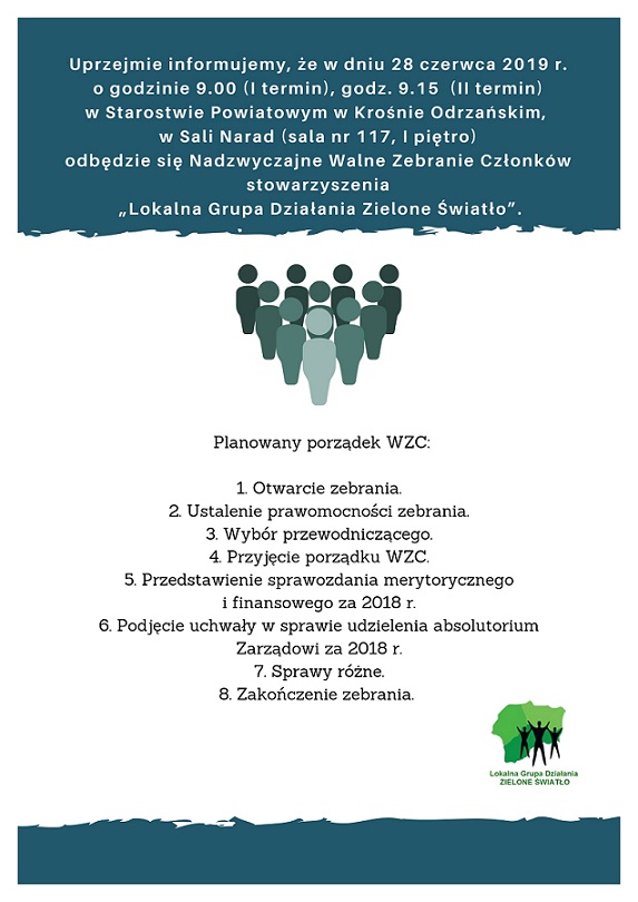 Uprzejmie informujemy, że w dniu 28 czerwca 2019r. o godzinie 9:00 (I termin), godz. 9:15 (II termin) w Starostwie Powiatowym w Krośnie Odrzańskim, w Sali Narad (sala nr 117, I piętro) odbędzie się Nadzwyczajne Walne Zebranie Członków stowarzyszenia "Lokalna Grupa Działania Zielone Światło".