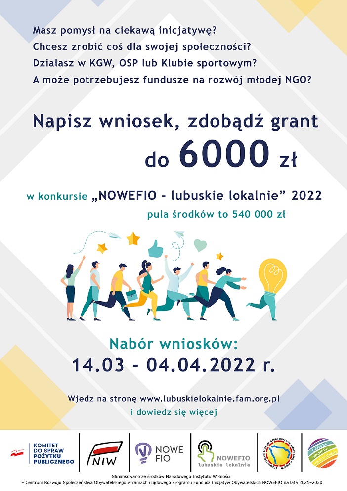 Stowarzyszenie LGD „Między Odrą a Bobrem” wspólnie z Fundacją Rozwoju Holistycznego 14.03.2022 r. rozpoczęło nabór wniosków na mikrodotacje w ramach projektu „NOWEFIO –lubuskie lokalnie”, sfinansowanego przez Narodowy Instytut Wolności - Centrum Rozwoju Społeczeństwa Obywatelskiego ze środków rządowego Programu Fundusz Inicjatyw Obywatelskich NOWEFIO na lata 2021-2030. Nabór prowadzony będzie do 04.04.2022 r., do godz. 23:59. Wnioski wraz z załącznikami należy składać wyłącznie pocztą elektroniczną na adres: Ten adres pocztowy jest chroniony przed spamowaniem. Aby go zobaczyć, konieczne jest włączenie w przeglądarce obsługi JavaScript.