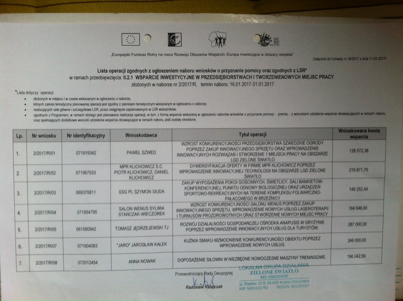 LGD Zielone Światło informuje o wynikach naboru 1/2017/P, w ramach przedsięwzięcia II.2.1 WSPARCIE INWESTYCYJNE W PRZEDSIĘBIORSTWACH I TWORZENIENOWYCH MIEJSC PRACY w ramach poddziałania 19.2 "Wsparcie na wdrażanie operacji w ramach strategii rozwoju lokalnego kierowanego przez społeczność" objętego PROW 2014-2020.