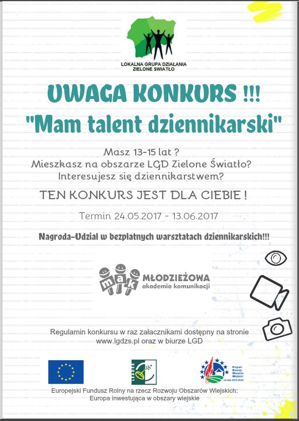 Stowarzyszenie „Lokalna Grupa Działania Zielone Światło” w ramach międzynarodowego projektu współpracy o nazwie „Młodzieżowa Akademia Komunikacji” ogłasza konkurs „Mam talent dziennikarski”, skierowany do młodzieży gimnazjalnej w wieku 13-15 lat. Celem konkursu jest wyłonienie młodzieży gimnazjalnej wykazującej szczególne zainteresowanie tematyką dziennikarstwa. Konkurs będzie skierowany do osób zamieszkałych na terenie „LGD Zielone Światło”,tj.: gminy Bobrowice, Bytnica, Dąbie, Krosno Odrzańskie, Maszewo.