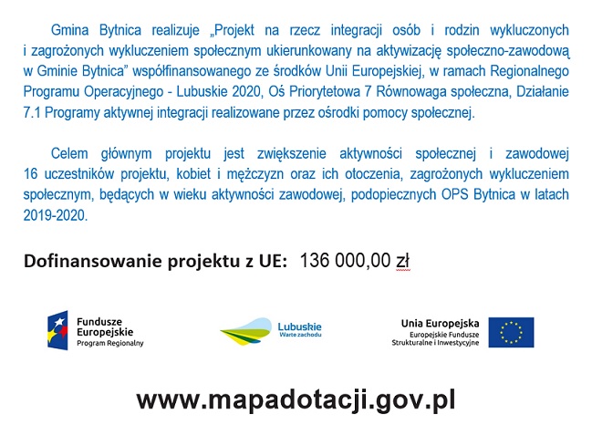 Ośrodek Pomocy Społecznej w Bytnicy zaprasza do wzięcia udziału w projekcie pod nazwą „Projekt na rzecz integracji osób i rodzin wykluczonych i zagrożonych wykluczeniem społecznym ukierunkowany na aktywizację społeczno-zawodową w Gminie Bytnica” współfinansowanym ze środków Europejskiego funduszu Społecznego. Projekt skierowany jest do osób bezrobotnych i nieaktywnych zawodowo, korzystających z pomocy OPS w Bytnicy.