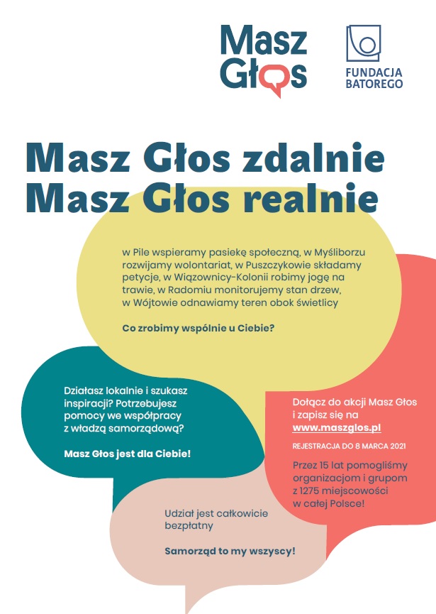 Ruszył nabór do akcji Masz Głos 2021 – programu Fundacji Batorego dla organizacji społecznych, grup nieformalnych i aktywistów z całej Polski, którzy działają dla swoich lokalnych środowisk. Mogą zajmować się różnymi sprawami: ekologią, przestrzenią publiczną, lokalnymi przepisami, edukacją, działaniem na rzecz młodzieży, seniorów, osób z niepełnosprawnościami – każda z tych inicjatyw jest ważna w akcji Masz Głos. Akcja Masz Głos pomaga im nawiązać współpracę z lokalną władzą i zaangażować do działania mieszkańców. Na bieżąco wspiera poradami ekspertów, organizuje wymianę doświadczeń pomiędzy uczestnikami z różnych gmin.