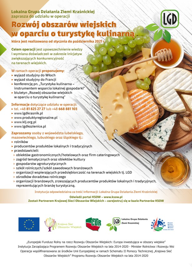 Lokalna Grupa Działania Ziemi Kraśnickiej w partnerstwie z Polską Izbą Produktu Regionalnego i Lokalnego w Warszawie, Stowarzyszeniem Kraina Lasów i Jezior –Lokalna Grupa Działania oraz Stowarzyszeniem Lokalna Grupa Działania „Puszcza Kozienicka” zaprasza do udziału w wyjeździe studyjnym do Włoch w ramach operacji pn. „Rozwój obszarów wiejskich w oparciu o turystykę kulinarną w dniach 9-13 sierpnia 2021 roku Celem wyjazdu studyjnego jest upowszechnienie wiedzy i wymiana doświadczeń w zakresie inicjatyw zwiększających konkurencyjność na terenach wiejskich.