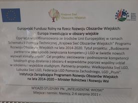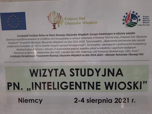 W dniach 2-4 sierpnia br. Wielkopolska Sieć LGD zorganizowała wyjazd studyjny pn. „Inteligentne wioski” do LAG Fläming-Havel w Niemczech, w ramach operacji "Budowanie partnerstw jako sposób zwiększania kompetencji LGD w świetle nowych wyzwań klimatycznych". Celem projektu było sieciowanie i podnoszenie kompetencji lokalnych grup działania z obszaru 4 województw: wielkopolskiego, lubuskiego, zachodniopomorskiego i łódzkiego, poprzez wspólny udział w szkoleniu i wyjeździe studyjnym.
