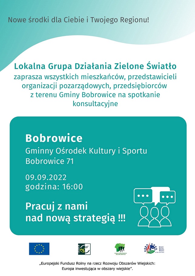 Zapraszamy Mieszkańców gminy Bobrowice na spotkanie konsultacyjne przygotowania Lokalnej Strategii Rozwoju na nowy okres finansowania 2021-2027, które odbędzie się dnia 9 września 2022 r. o godz. 16:00 w Gminnym Ośrodku Kultury i Sportu w Bobrowicach.