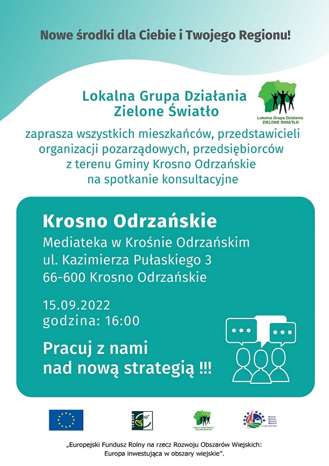 Zapraszamy Mieszkańców gminy Krosno Odrzańskie na spotkanie konsultacyjne przygotowania Lokalnej Strategii Rozwoju na nowy okres finansowania 2021-2027, które odbędzie się dnia 15 września 2022 r. o godz. 16:00 w Mediatece w Krośnie Odrzańskim.