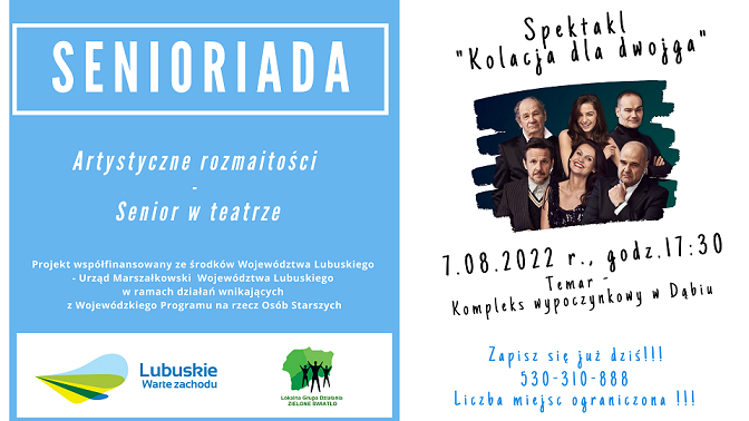 Serdecznie zapraszamy osoby 60+, dnia 7 sierpnia 2022 r. o godzinie 17:30 na Artystyczne rozmaitości – Senior w teatrze, czyli spektakl „Kolacja dla dwojga.