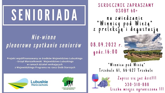 Serdecznie zapraszamy osoby 60+ na Nie-winne plenerowe spotkanie seniorów, czyli zwiedzanie "Winnicy pod Wieżą" z prelekcją i degustacją, dnia 8 września 2022 r., o godz.16:00.