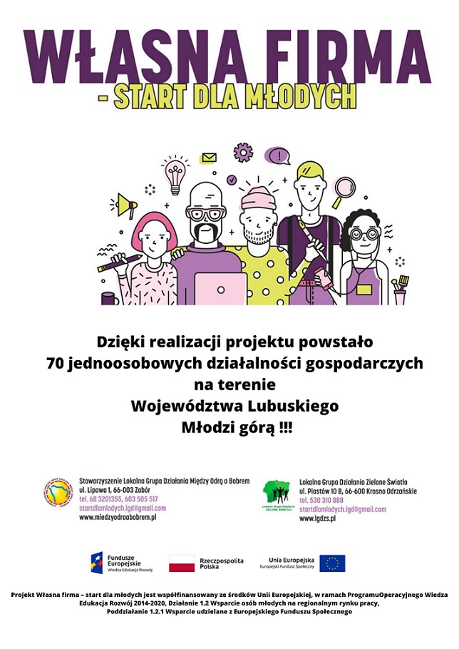 Projekt „Własna firma – start dla młodych” był współfinansowany ze środków Unii Europejskiej, w ramach Programu Operacyjnego Wiedza Edukacja Rozwój 2014-2020, Działanie 1.2 Wsparcie osób młodych na regionalnym rynku pracy, Poddziałanie 1.2.1 Wsparcie udzielane z Europejskiego Funduszu Społecznego.