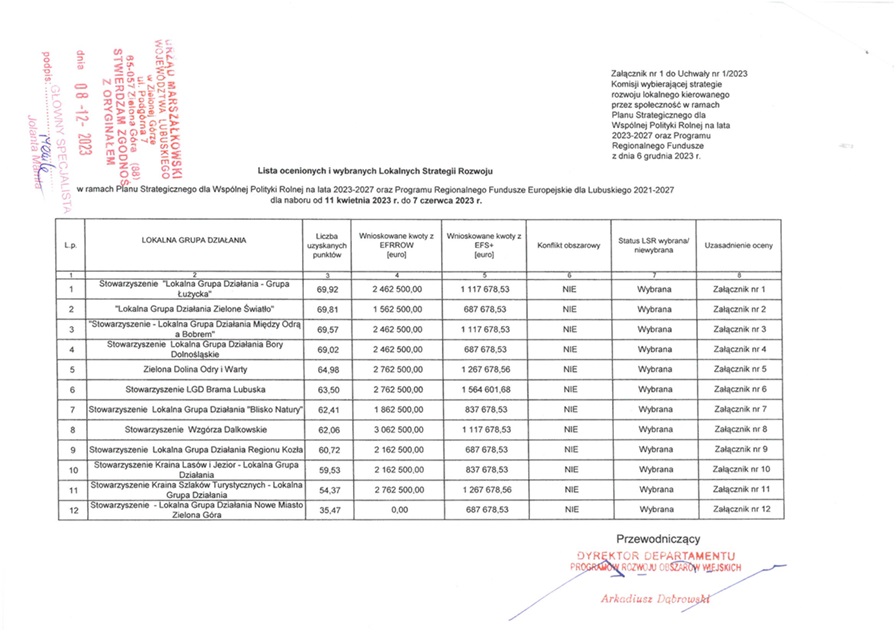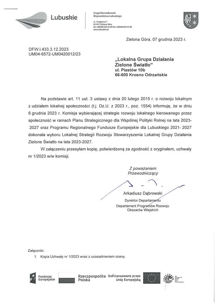 Szanowni Państwo, z wielką przyjemnością informujemy, iż w ramach Planu Strategicznego dla Wspólnej Polityki Rolnej na lata 2023-2027 oraz Programu Regionalnego Funduszy Europejskich dla Lubuskiego 2021-2027 nasza strategia rozwoju lokalnego kierowanego przez społeczność na lata 2023-2027 została wybrana do finansowania.