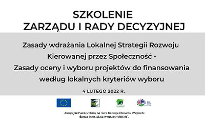W dniu 04.02.2022 r. w Brzeźnicy odbyło się szkolenie dla członków Zarządu i Rady Decyzyjnej LGD Zielone Światło w zakresie z zasad wdrażania Lokalnej Strategii Rozwoju Kierowanej przez Społeczność - oceny i wyboru projektów do finansowania według lokalnych kryteriów wyboru. Szkolenie miało na celu przygotowanie osób zaangażowanych we wdrażanie LSR do procesu oceny i wyboru operacji do finansowania przez LGD. Ze względu na niejednolitą interpretację opisów kryteriów, LGD przeprowadziło konsultacje w zakresie kryteriów wyboru operacji. Doprecyzowano zapisy w zakresie sposobu i źródła informacji do weryfikacji oraz spełnienia kryterium.