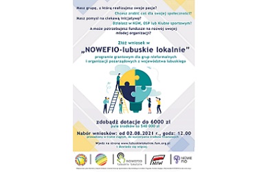 Stowarzyszenie LGD „Między Odrą a Bobrem” wspólnie z Fundacją Rozwoju Holistycznego 02.08.2021 r. o godz. 12:00 rozpoczynają nabór ciągły wniosków na mikrodotacje w ramach projektu „NOWEFIO –lubuskie lokalnie”, sfinansowanego przez Narodowy Instytut Wolności - Centrum Rozwoju Społeczeństwa Obywatelskiego ze środków Programu Fundusz Inicjatyw Obywatelskich na lata 2021-2030. Nabór prowadzony będzie do wyczerpania puli środków finansowych.