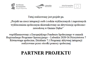 Gmina Dąbie/Ośrodek Pomocy Społecznej w Dąbiu w latach 2019-2020 przystąpiła do realizacji projektu „Projekt na rzecz integracji osób i rodzin wykluczonych i zagrożonych wykluczeniem społecznym ukierunkowany na aktywizację społeczno– zawodową w Gminie Dąbie”. Projekt współfinansowany jest ze środków Europejskiego Funduszu Społecznego w ramach Regionalnego Programu Operacyjnego Lubuskie 2020, Działania 7.1 Programy aktywnej integracji realizowane przez Ośrodki Pomocy Społecznej. Projekt realizowany był w okresie od 01 kwietnia 2019r. do 31 grudnia 2020r. Projekt był realizowany w Partnerstwie ze Stowarzyszeniem Lokalna Grupa Działania Zielone Światło w Krośnie Odrzańskim. Celem głównym projektu była aktywizacja zawodowa i społeczna mieszkańców Gminy Dąbie zagrożonych wykluczeniem społecznym. Do udziału zakwalifikowanych zostało 18 osób bezrobotnych, biernych zawodowo w wieku aktywności zawodowej, zagrożonych wykluczeniem społecznym, korzystających ze świadczeń pomocy społecznej. Poprzez udział w warsztatach, kursach i szkoleniach uczestnicy zdobyli nowe kwalifikacje, zwiększając tym samym swoje szanse na rynku pracy. Do tego celu są stosowane tzw. instrumenty aktywnej integracji.